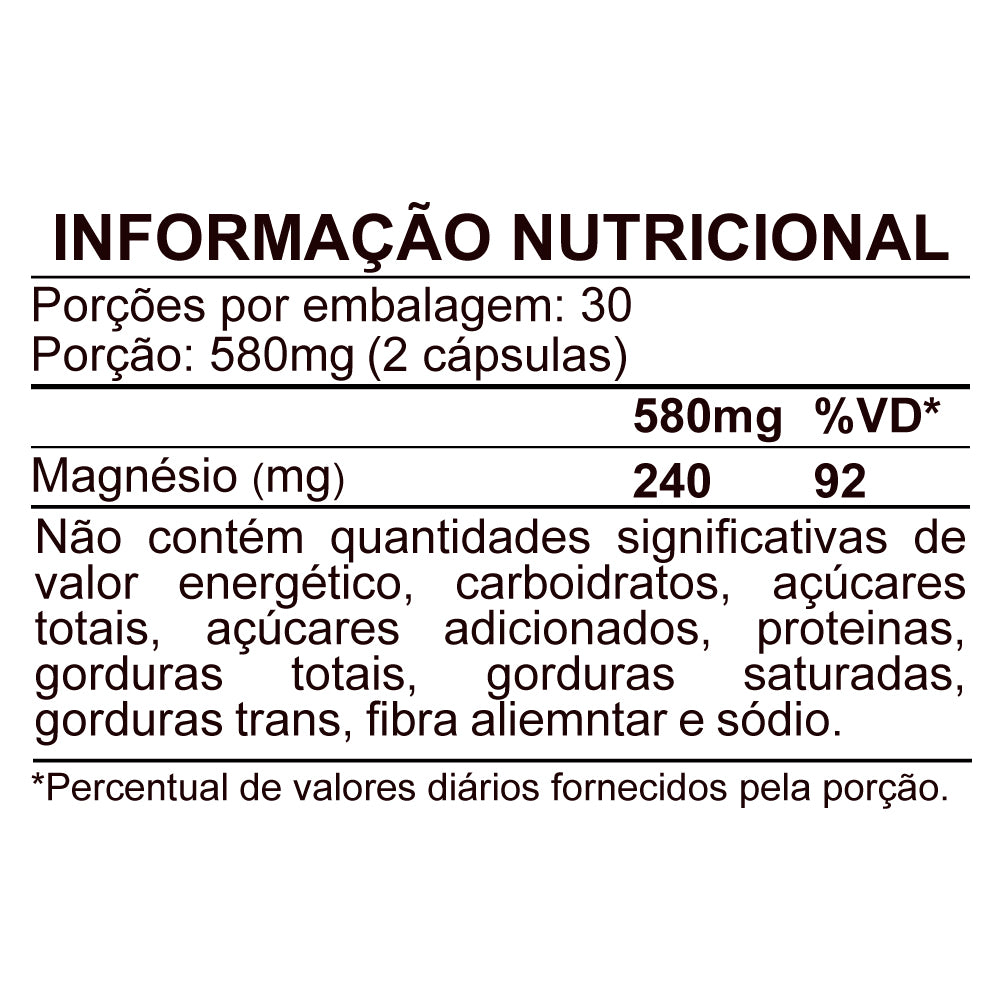 Bisglicinato de Magnésio, Magnésio Malato, Agente de Massa Celulose Microcistalina, Antiumectante Estearato de Magnézio e Hidroxipropilcelulose. NÃO CONTÉM GLÚTEM.