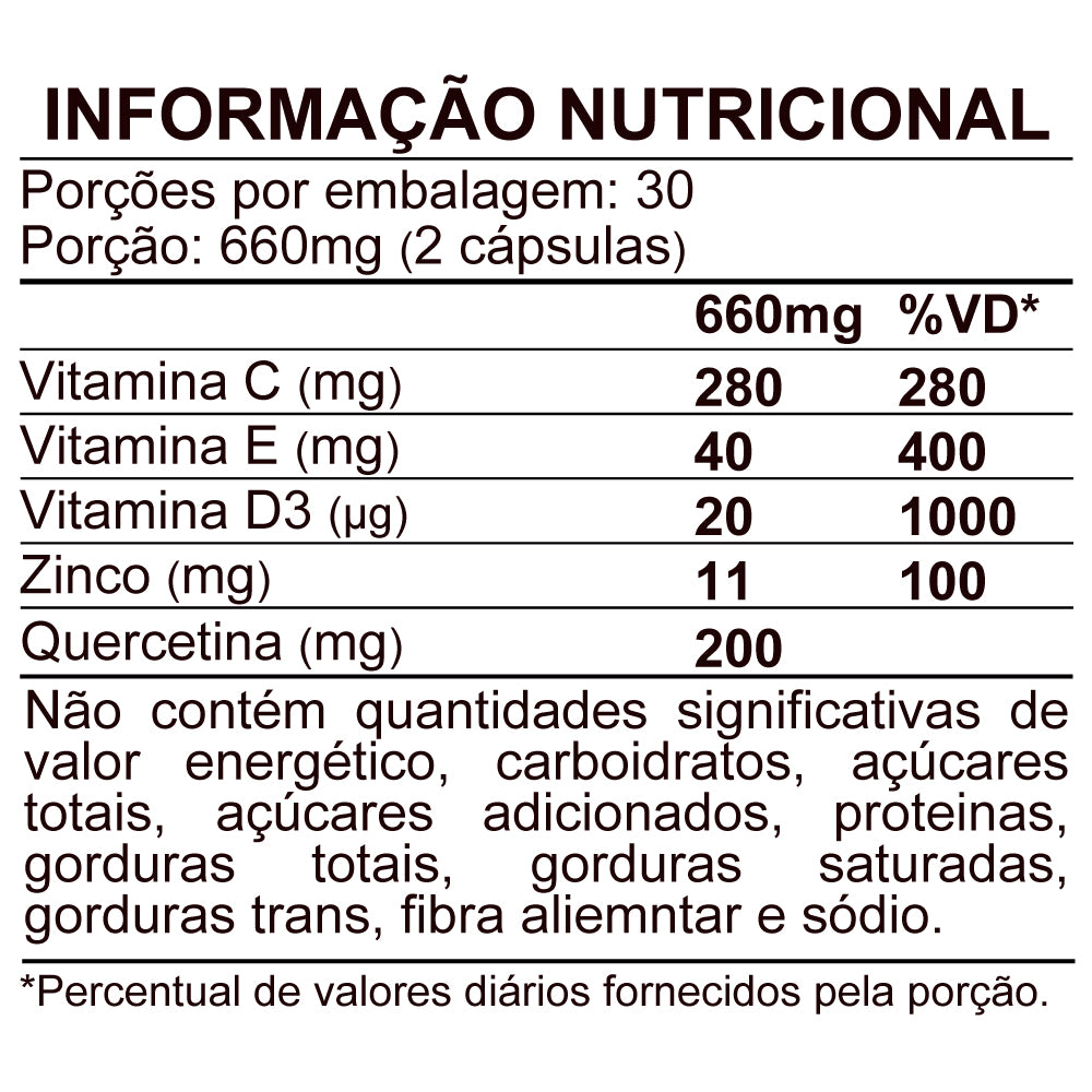 INGREDIENTES: Ácido Ascorbíco, Quercetina Anidra, Acetato de DL-alfa-tocoferol, Bisglicinato de Zinco, Colecalciferol, Agente de Massa Celulose Microcistalina, Antiumectante Estearato de Magnézio e Hidroxipropilcelulose. NÃO CONTÉM GLÚTEM.